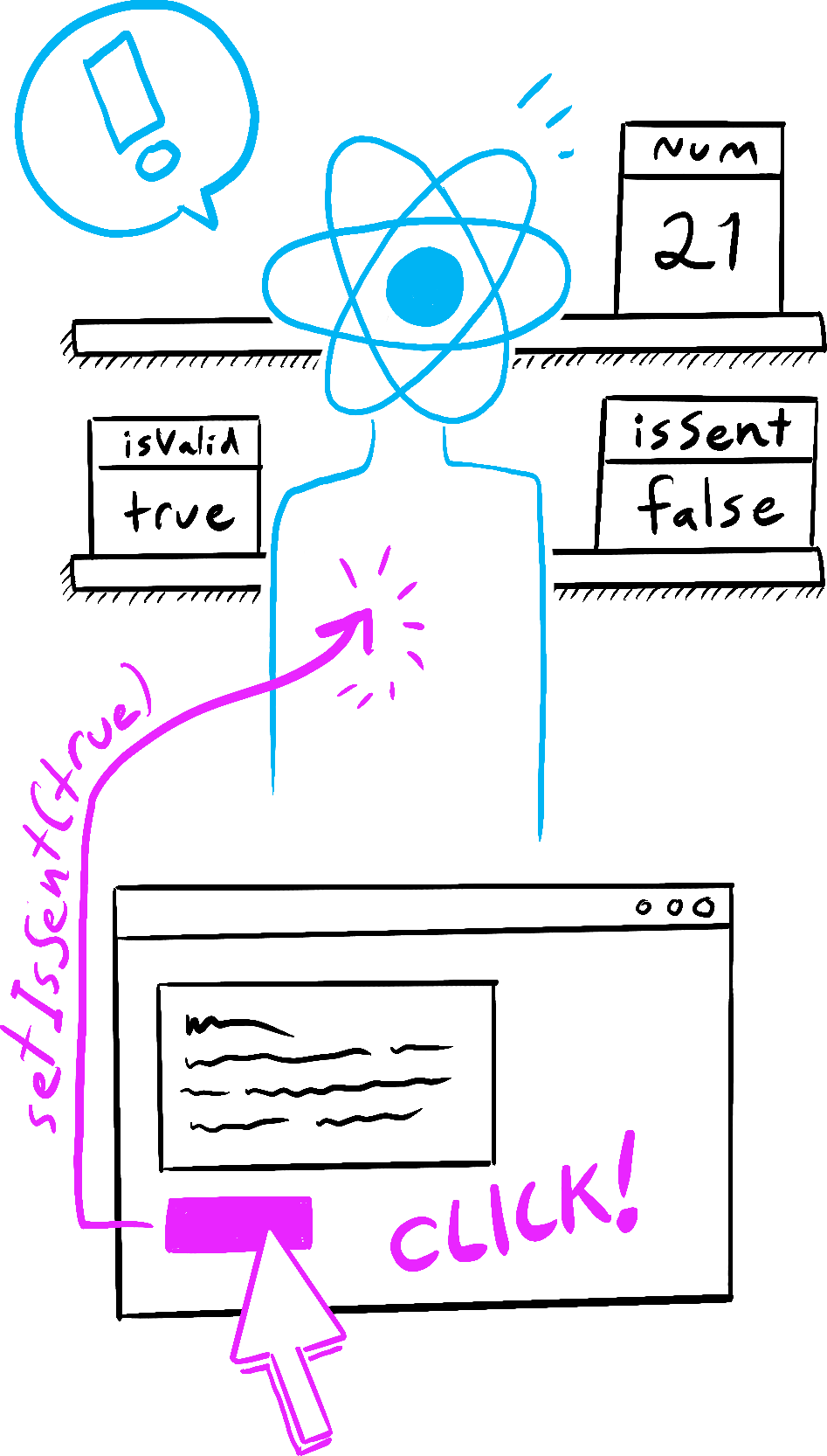 In this example, when you press “send”, setIsSent(true) tells React to re-render the UI: